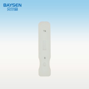 A na-ekpuchi akpụkpọ ahụ nke ngwaọrụ ule na conjugate nke BSA na T3 na mpaghara ule na ewu mgbochi oke bekee IgG na mpaghara nchịkwa. A na-ekpuchi pad ihe nrịbama site na akara fluorescence antibody T3 na oke bekee IgG tupu oge eruo. Mgbe a na-anwale sample, TT3 na sample jikọtara na fluorescence akara mgbochi T3 mgbochi, na-etolite dịghịzi ngwakọta. N'okpuru omume nke immunochromatography, mgbagwoju eruba na ntụziaka nke absorbent akwụkwọ, mgbe mgbagwoju gafere ule mpaghara, The free fluorescent marker ga-ejikọta na T3 na membrane. The ịta nke TT3 bụ adịghị mma mmekọrịta maka fluorescence mgbaàmà, na ịta nke TT3 na sample nwere ike chọpụtara site fluorescence immunoassay nyocha.