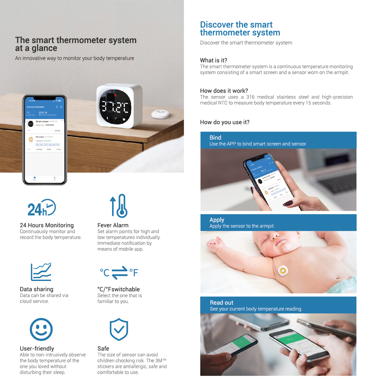 The smart thermometer system is a continuous temperature monitoringsystem consisting of a smart screen and a sensor worn on the armpit.The sensor uses a 316 medical stainless steel and high-precisionmedical NTC to measure body temperature every 15 seconds.